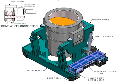 In industrial furnace operations, auxiliary handling equipment is essential for the safe and efficient movement of molten materials. A ladle trolley is used to transport ladles containing molten metal from the furnace to casting, refining, or holding stations. It is built with heat-resistant materials and designed to carry heavy loads smoothly, reducing reliance on overhead cranes and minimizing the risk of spillage or accidents. A slag-pot trolley is used to collect and move molten slag discharged from the furnace to dumping or cooling areas. This equipment ensures safe slag removal, protects furnace surroundings and plant flooring, reduces worker exposure to high temperatures, and helps maintain a clean and safe industrial furnace environment.